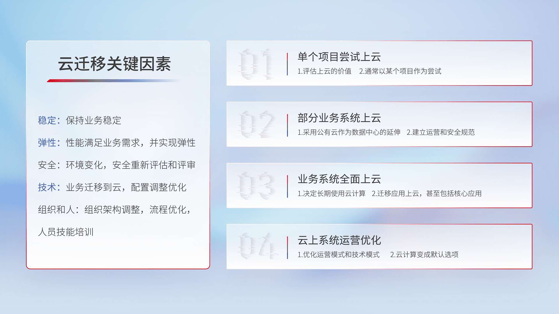 结合实际业务,,从规划设计、、、、云平台选型、、云原生改造、、数据迁移、、集成交付,,,,迁移全过程为客户识别最佳上云路径,,,,做好风险识别管理,,,,设计网络架构、、、、身份权限、、安全审计合规、、、、操作审计、、、、日志审计、、监控告警策略、、、多站点容灾设计等,,,对云上基础设施进行整体规划,,提升IT治理水平,,以满足弹性、、、高可用、、、、高性能的需求。。