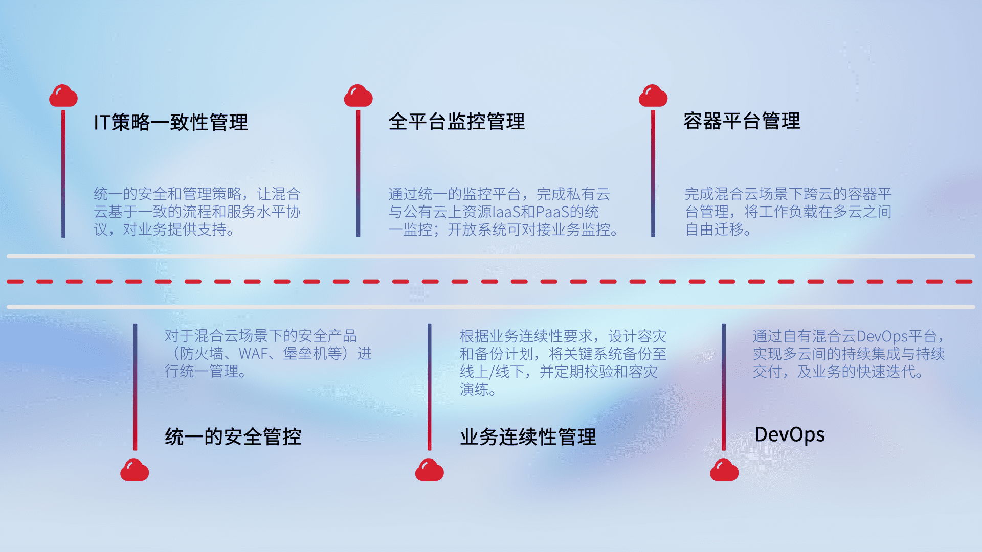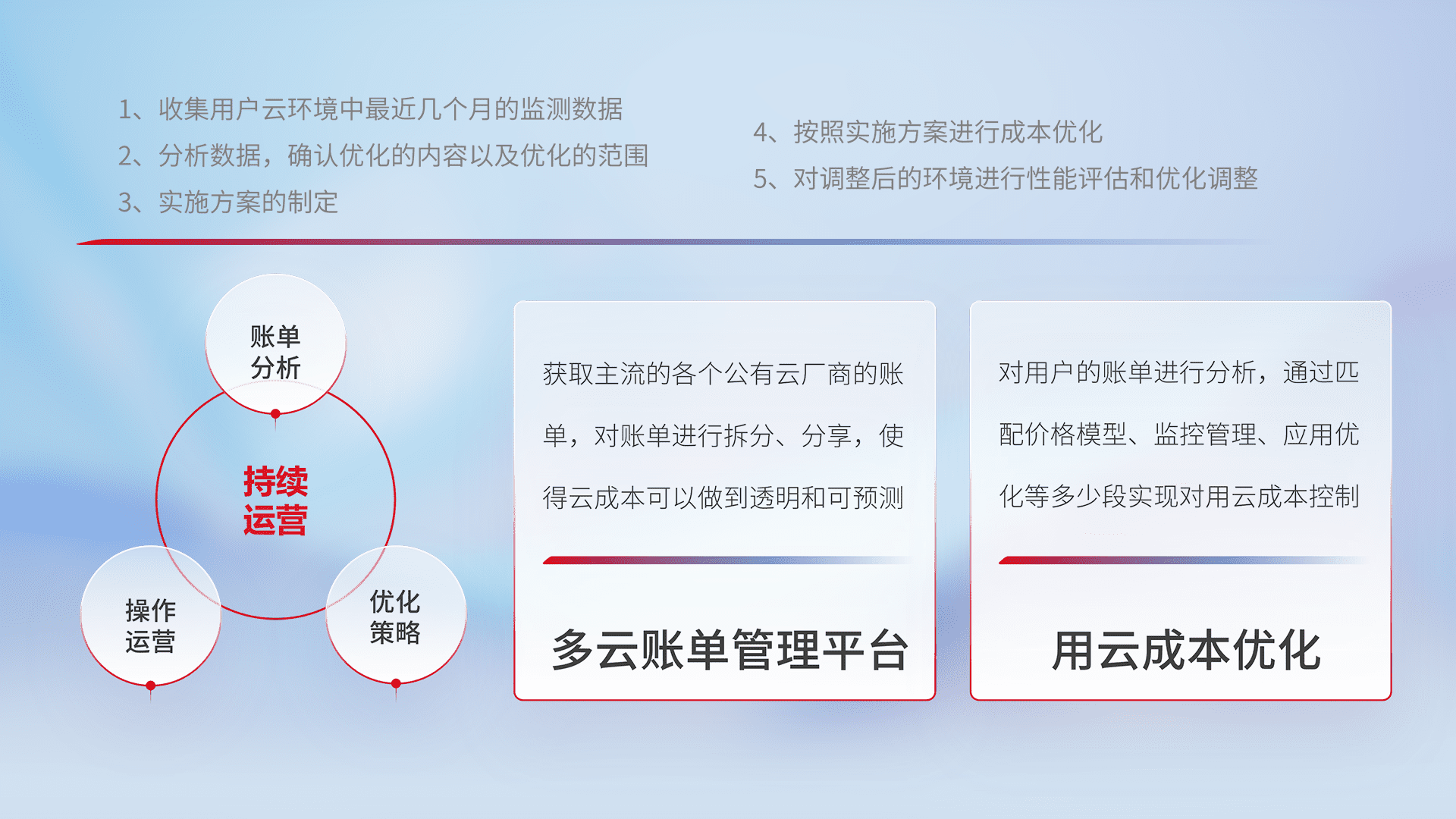 通过多云纳管,,,以统一的资源数据模型把客户的云资源进行抽象和封装,,进而实现对多云资源的统一操作,,,,保障云资源管理的可靠性、、、稳定性与可用性。。。。量身定制化运维内容,,配置、、、开发运维、、、补丁管理、、、、备份、、、、监控、、、认证和访问管理、、审计和日常巡检等,,保障在用云过程中的可靠度,,稳定度以及高可用率。。