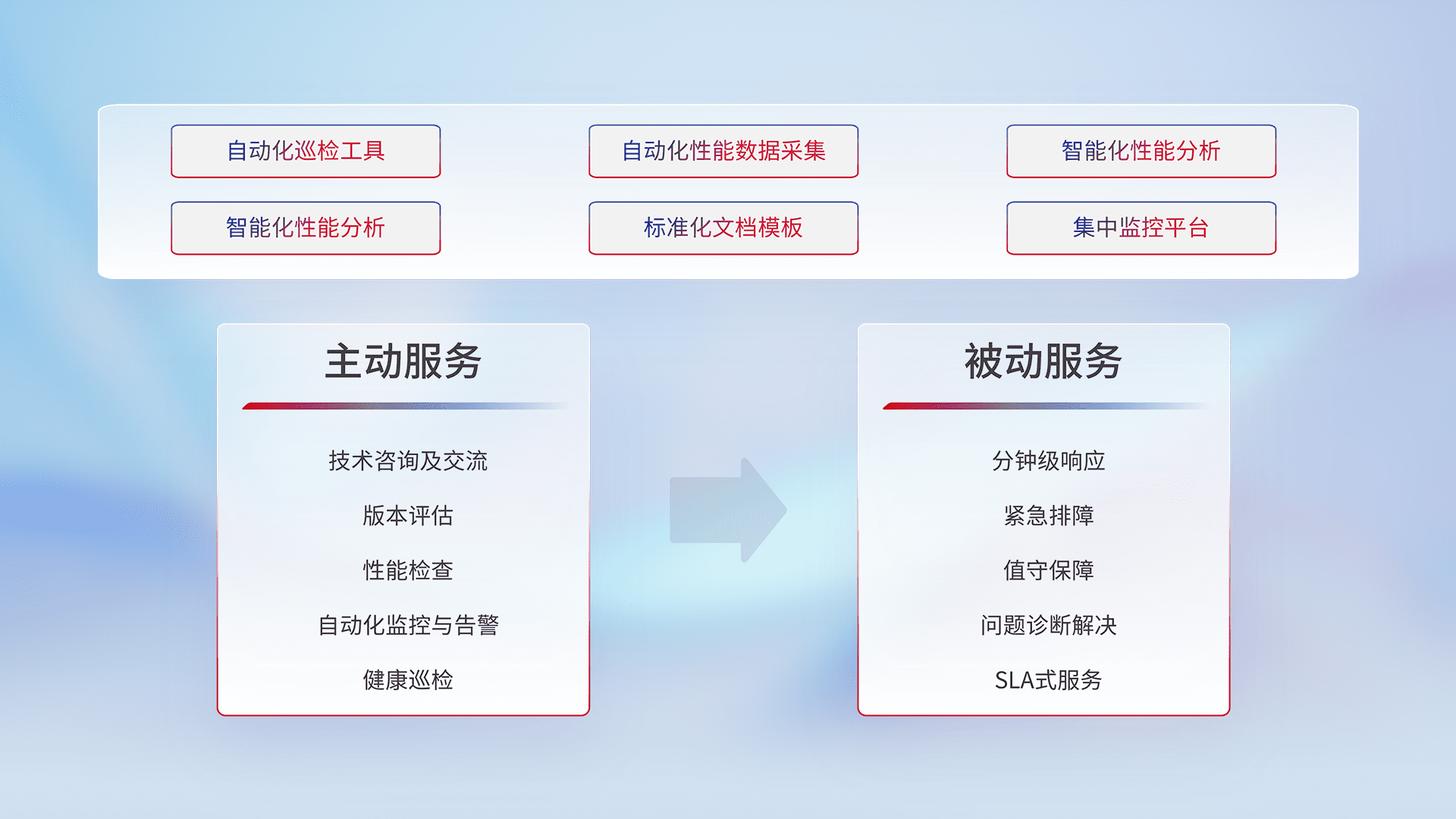 智能化工具和标准化文档,,,,保障服务质量,,,提供主动服务(包含技术咨询、、版本评估、、性能检查、、、、自动化监控与告警、、、、健康巡检)和被动服务包含(分钟级响应、、紧急排障、、、值守保障、、、、问题诊断解决、、、、SLA服务)。。